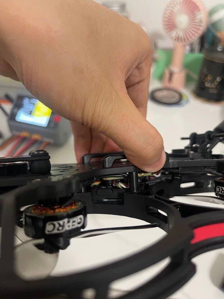 A re-engineered battery mounting system uses high-strength 7075 aluminum components and secure tie straps for a solid, stable hold during dynamic maneuvers. The XT60E1-M power connector is now seamlessly built into the carbon plate, creating a cleaner, more convenient power setup.